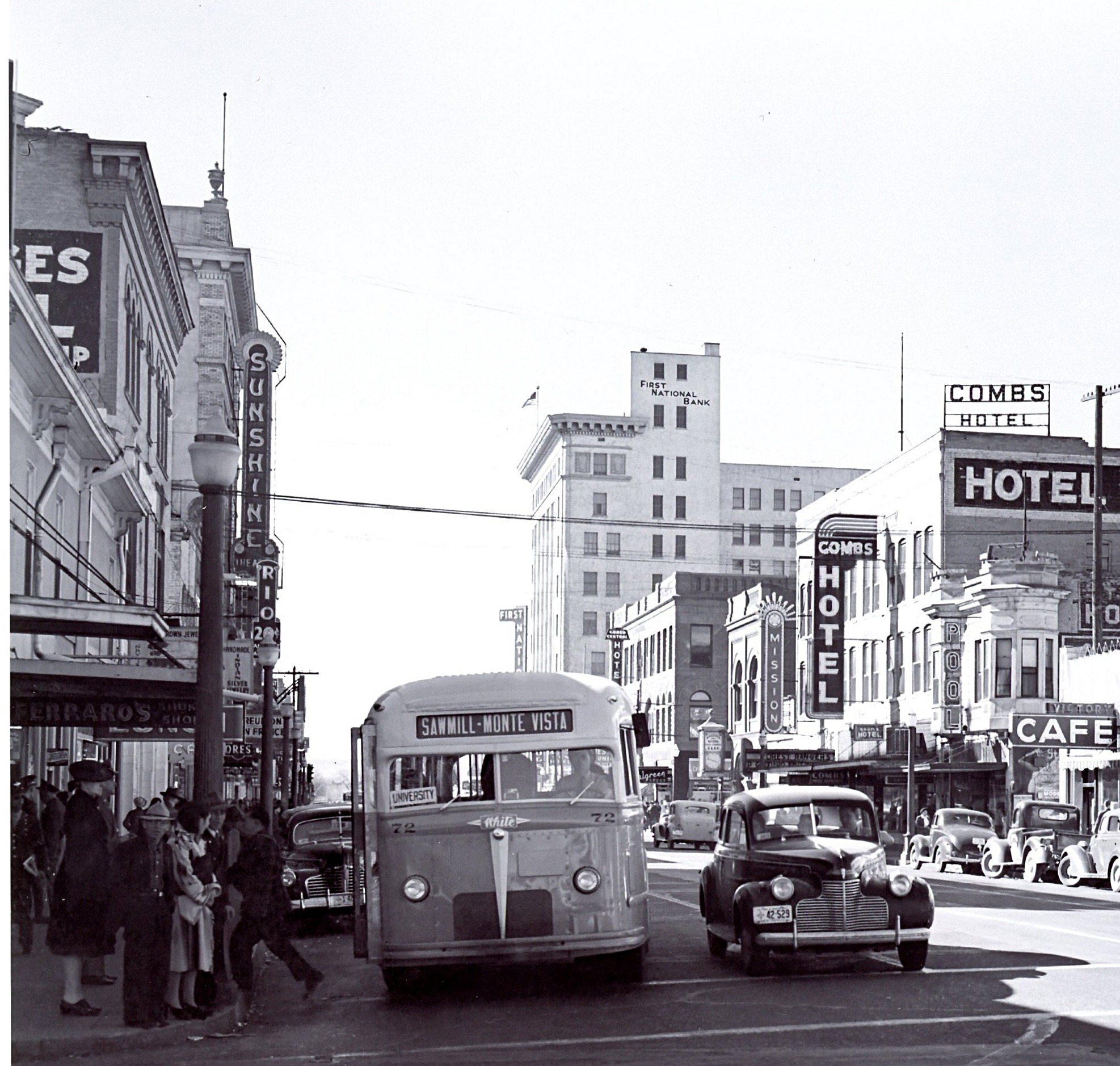 Central Avenue in Albuquerque, looking west from First Street. The Alvarado Hotel would have been directly behind the photographer in this photo taken in 1943. The cars both to the left and to the right of the White bus have 1942 metal plates on their bumpers, revalidated by 1943 paper stickers in the lower left corner (as viewed from the outside) of the windshields. One would expect the bus to have had both a metal Commercial plate and a windshield sticker, too, but for unknown reasons it has neither. Location verification courtesy Rick Holben.