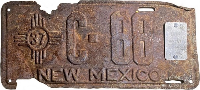 affixed. In New Mexico buses and taxis were in the early years closely allied classes of vehicles which were differentiated by law as follows: Taxicabs: Motor vehicles for the transportation of persons for hire, having a normal seating capacity of not more than seven persons. Bus: Motor vehicles for the transportation of persons for hire, having a normal seating capacity in excess of seven persons. There might be little difference in the appearance, therefore, between a 7-passenger taxi and an 8-passenger bus. And an examination of the seals on these plates shows that they don’t always follow the above definitions. In 1955 a new type of Bus plate was introduced, bearing just a prefix of “B.” Note: The weight/capacity seals used on these plates are commonly called “tabs” today, but during the years they were in use the only name applied to them was “seal.” |