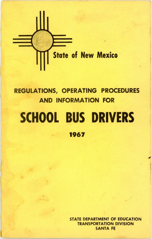 | 1967 Regulations, Operating Procedures, and Information for School Bus Drivers. 5½ x 8½ inches, 42 pages plus covers. Includes information for all aspects of operating school buses, including parking, loading and discharging passengers, emergencies, first aid, reporting students who refuse to follow rules, etc. |