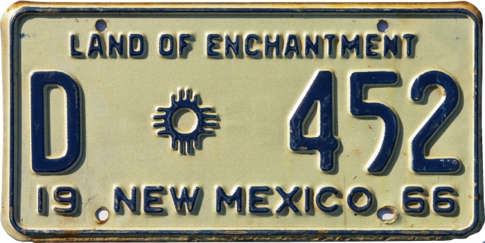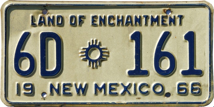 | 1966 Truck plates were produced in two distinct varieties. Those with one-digit county codes have an embossed “66” in the lower left corner, while those with two-digit county codes have a pre-applied Scotchlite “66” sticker in the lower right corner. Both styles were renewed with later-year stickers placed in the lower right corner. On those with 1-digit county numbers the Land of Enchantment slogan is centered, while on those with 2-digit county numbers the slogan is offset to the right. | ||||||||||||||||||||||||||||||||||||||||||||||||||||||