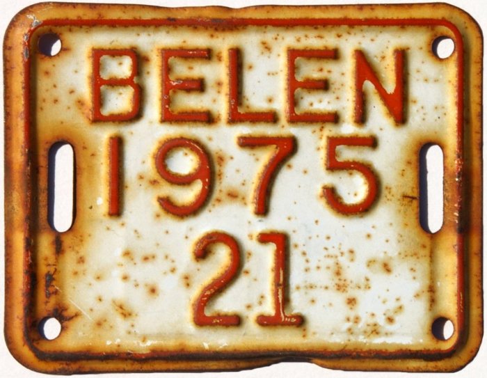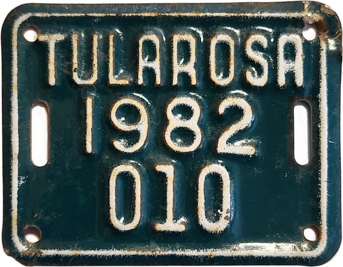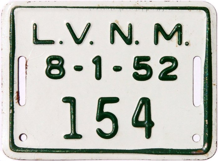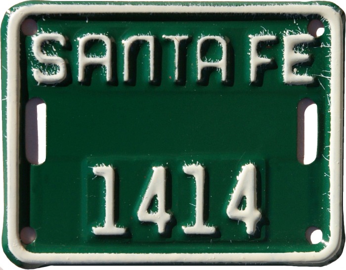 | The city of Santa Fe mandated as early as 1910 that bicycles be licensed but apparently had no requirement for them to display license plates. Over the following decades other municipalities introduced bicycle licensing and ultimately began passing out tiny license plates to be affixed to the bikes. Measuring from a little over 2" x 2" to a little over 2" x 4", the oldest of those known to survive today is a Santa Fe tag dating from 1946, but there were undoubtedly others in use before that date. |