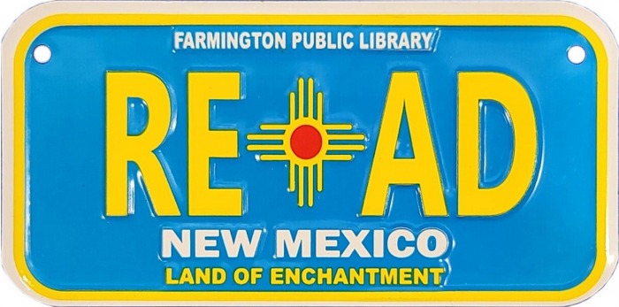 Toy license plate measuring 2¾" x 6", advertising the Farmington, NM Public Library.