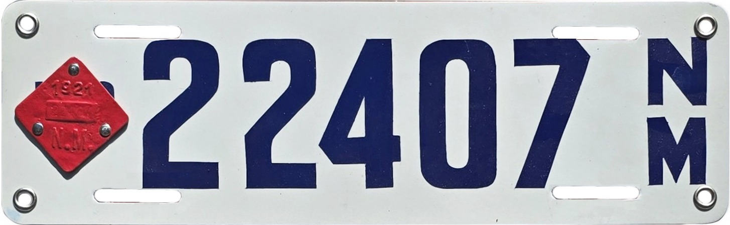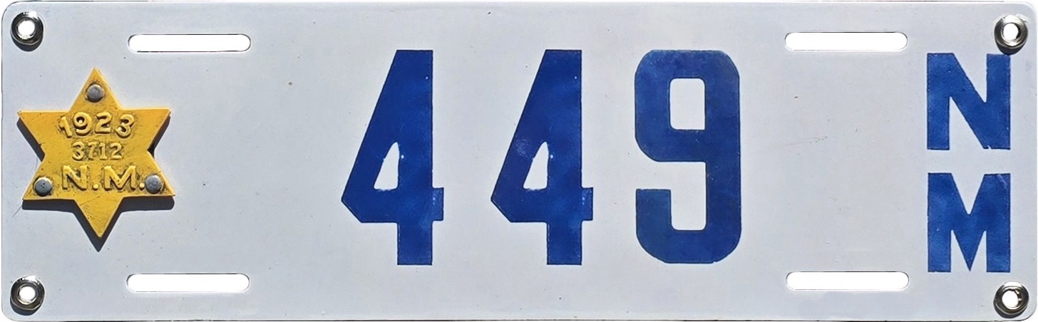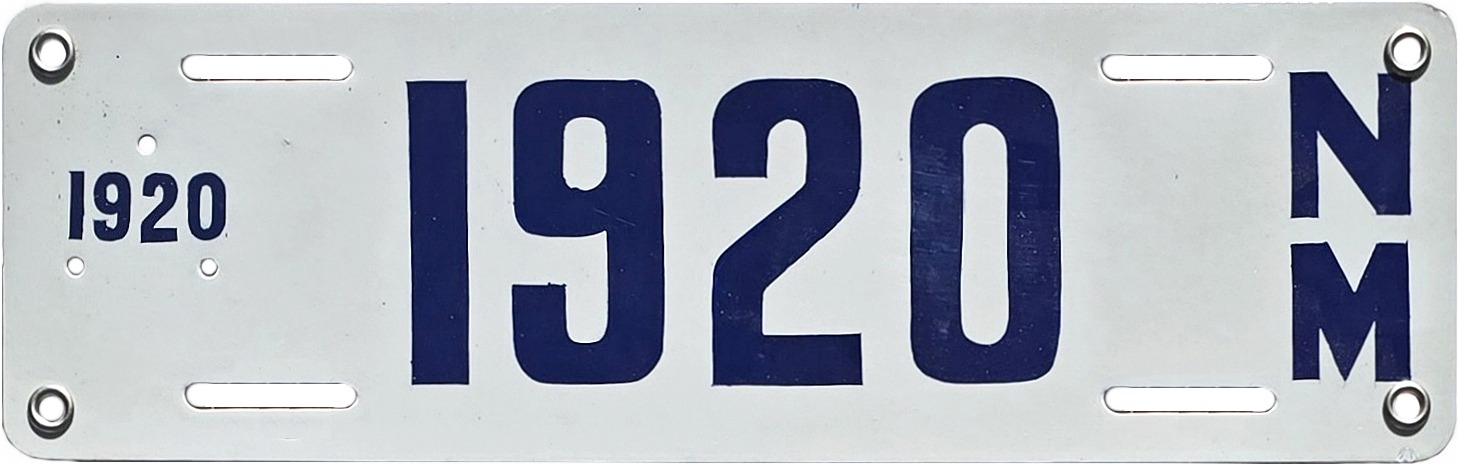 | There is much we don’t know about this plate, including who made it, why, or when. But we do know that it’s not a 1912 plate as it purports to be. Rather, it’s a 1920s era porcelain plate on which someone hand painted the 1912 date. There are other things about it that are wrong as well. New Mexico’s 1912 plates were embossed steel, not porcelain on flat steel, and they were neither this size nor this shape. The highest plate number issued in 1912 was 904, making the 14517 number on the plate too high by more than 13,000. This plate is mounted on a plaque which claims that it was found at the Fort “Crag” dump. There is no such place as Fort “Crag,” but from 1854 to 1885 there was a Fort Craig about 35 miles south of Socorro, having been abandoned some 27 years before 1912. (We also don’t know if the 14517 accurately represents the porcelain’s original number, but if it does that plate was registered in 1920 to Alberto Richards of Columbus, NM for a Maxwell touring car.) Photo courtesy of Patrick Phillips. | ||||||||||||||||||||||||||||||||||||||||||||||||||||||||||||||||||||||||||||||||||||||||||||||