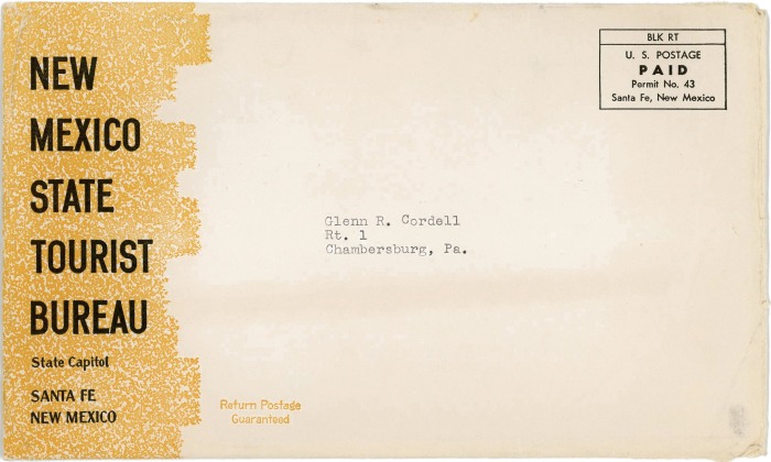 | Complete original 1959 mailing packet of letter from Governor Burroughs, along with 1958 State Highway Department road map and other tourism publications. | ||||