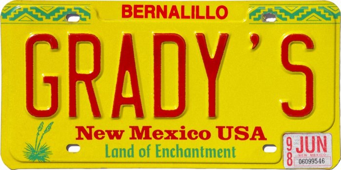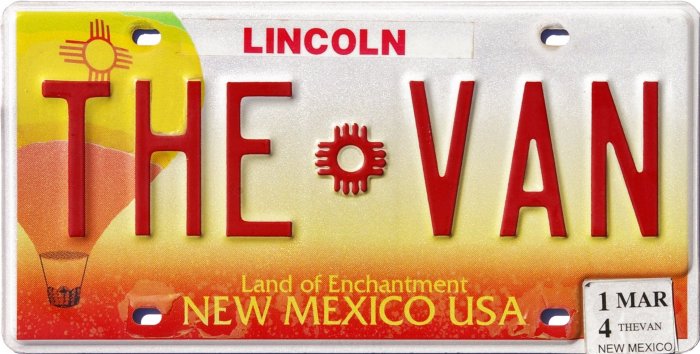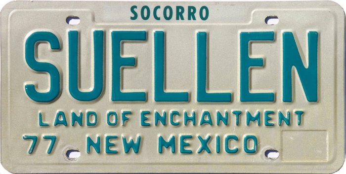 Special Characters on Vanity Plates. In addition to letters and numerals, New Mexico made available certain special characters which motorists could select for use on vanity plates, some of which were never available in any other state. These were the zia symbol, blank space, hyphen, apostrophe and the Spanish Ñ. Introduced a few years after personalized plates first became available here, New Mexico’s vanities thereby became among the most expressive and meaningful in the country. In the latter part of 2018, and without explanation, the MVD withdrew all of these special characters from use. Plates from the past bearing these characters, such as those immediately above, now stand as icons of a bygone era. Please see also Special Characters used on Motorcycle Vanity plates.