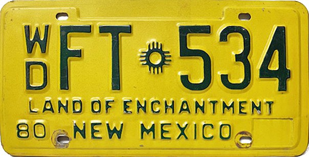 plate. Weight Distance and Weight Distance Farm Truck plates came about not as a result of an Act of the legislature, but through an administrative decision made by the State Transportation Department regarding vehicles exceeding 26,000 lbs. In October 1979 it was announced that while the Motor Vehicle Division would continue to title such vehicles, the responsibility for annual registration would be transferred to the Motor Transportation Division. Concurrent with this change, the registration certificates issued by the MVD would be replaced by the Cab Cards issued by the MTD, with the latter serving the same purpose. The change was officially effective January 1980, at which time the new Weight Distance and Weight Distance Farm Truck plates replaced the existing plates previously in use on these vehicles. Notwithstanding the January 1980 effective date, a very few 1979 Weight Distance plates are known to have been in use, with some surviving today, none of them known to have serial numbers higher than about 01200. [Deming Headlight, October 31, 1979] |
